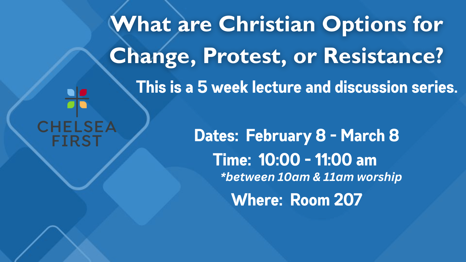 Chelsea First United Methodist Church (Chelsea First) is a Christ-centered congregation with a positive, open, and engaging spirit. We are the church for everyone, at all seasons of life, and bring a grounded, engaged, and supportive approach to Christian worship while working passionately toward making a positive impact in our community.